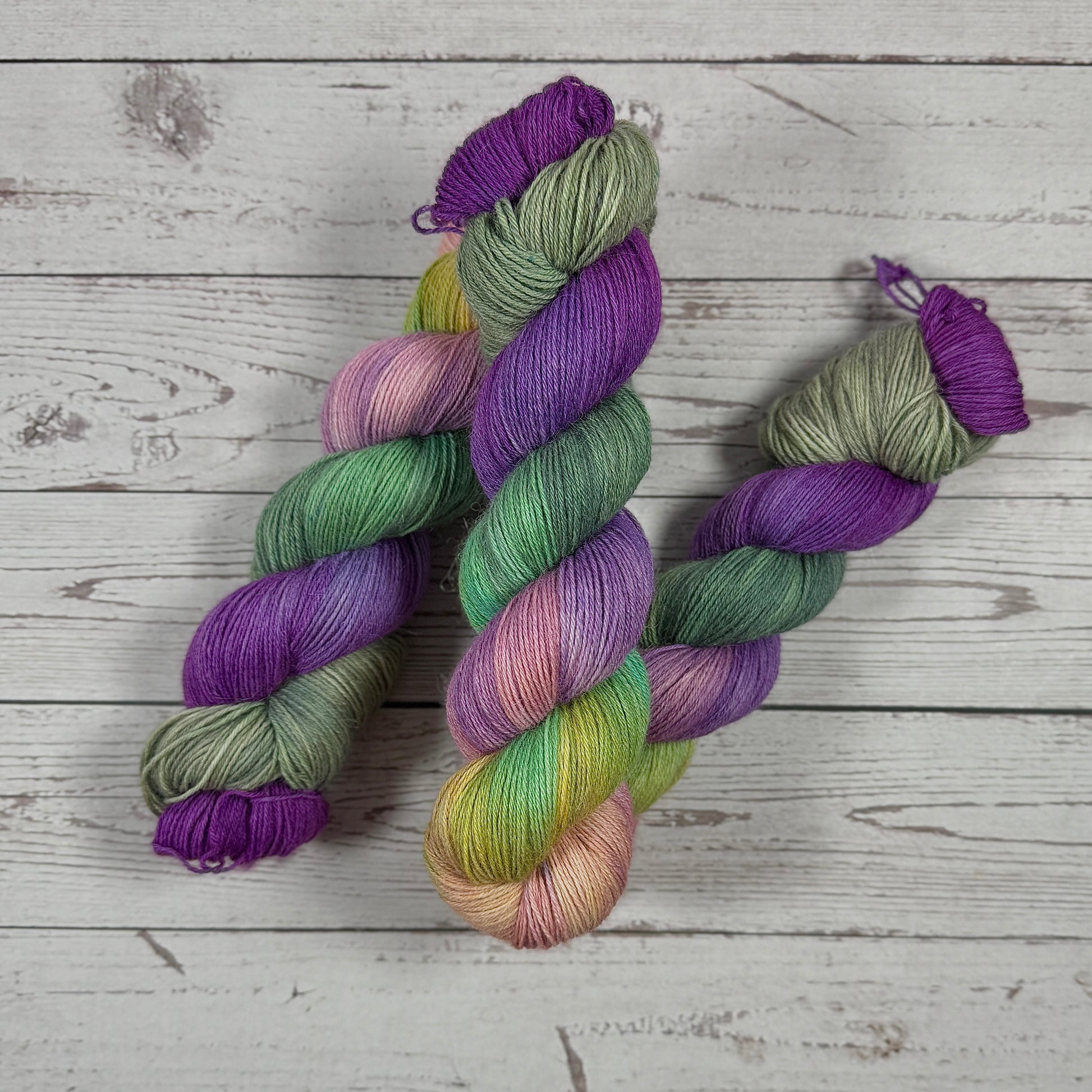 From dice dye episode 51 on my socials. A fun, bright colorway that not only gives sunset vibes but also Mardi Gras vibes. Purple, pink, yellow, blue, green and tan all smattered together to create this pretty colorway.