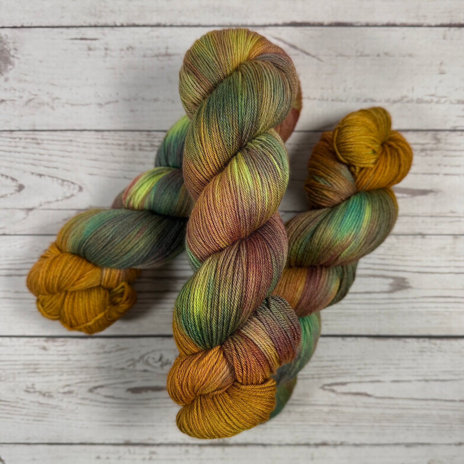 From dice dye episode 42 on my socials. A very fall inspired colorway. I call this skein leaf pile because it feels like jumping into a pile of raked up leaves. With orange, green and deep red it has all the colors of turning leaves. This color has a lot of variation in it.