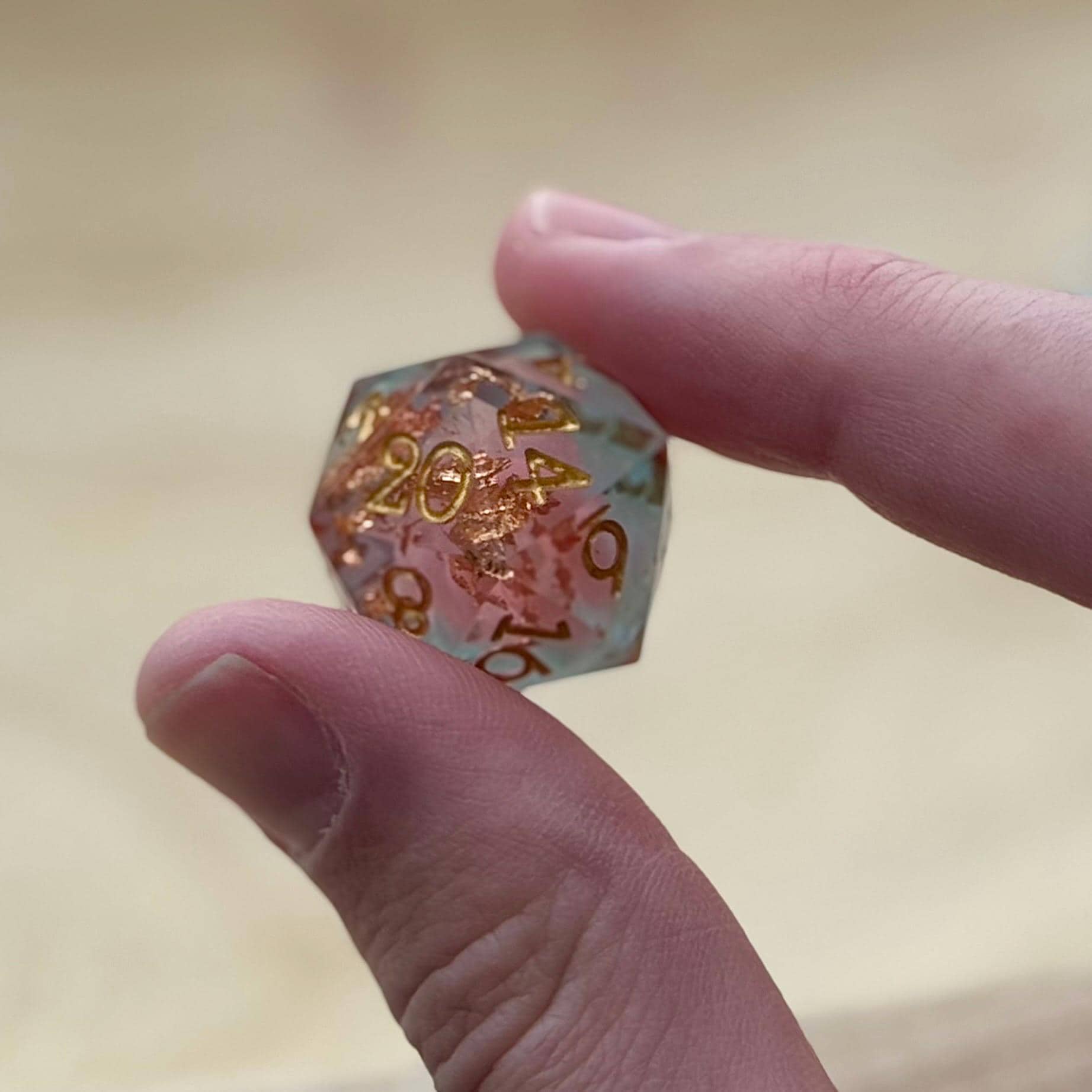 All dice sets are made by hand, sanded by hand, polished in a polisher and inked by hand.